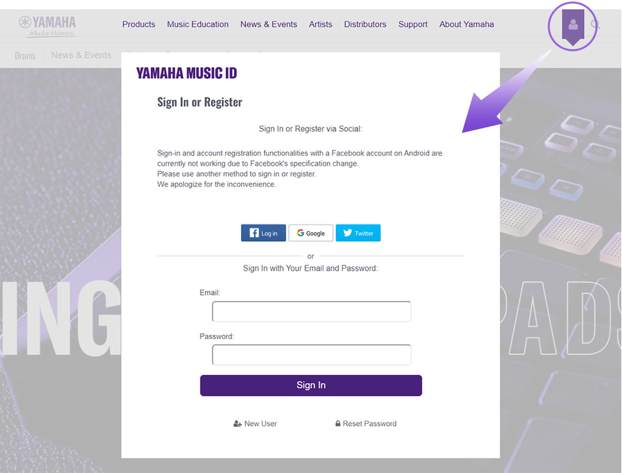 2. If you have not registered on Yamaha Music ID yet, please click “New User” or sign in using a social media account, and then fill in all the required fields.