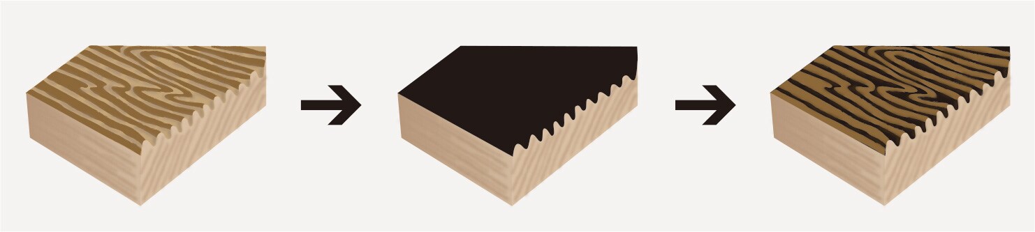 The traditional Japanese finishing technique known as "UZUKURI" has been modified for use on drum shells. In this procedure, the soft areas in the wood grain are sanded and then the whole shell is coated with a thin layer of black paint. The entire surface of the shell is then sanded again before the final coating is applied, in a process that emphasizes the natural beauty of the Oak grain.