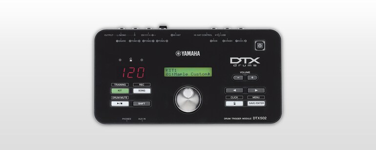 While the outside retains the familiar layout of the DTX500, inside the new DTX502 drum trigger module beats a brand new heart. We took the most popular Yamaha drum sounds and made them even better, and then we added 250 new voices including drum and cymbal sounds licensed from top VST developers that have been optimized for DTX. We also fine-tuned the trigger settings on this module and made them easy-to-use so that pads and triggers offer more expression than ever before. With expanded training functions you can become a better drummer, and with the wave-import feature you can add your own new sounds. The module accepts up to 12 trigger signals and our new design allows easy integration into an acoustic/electronic hybrid setup.