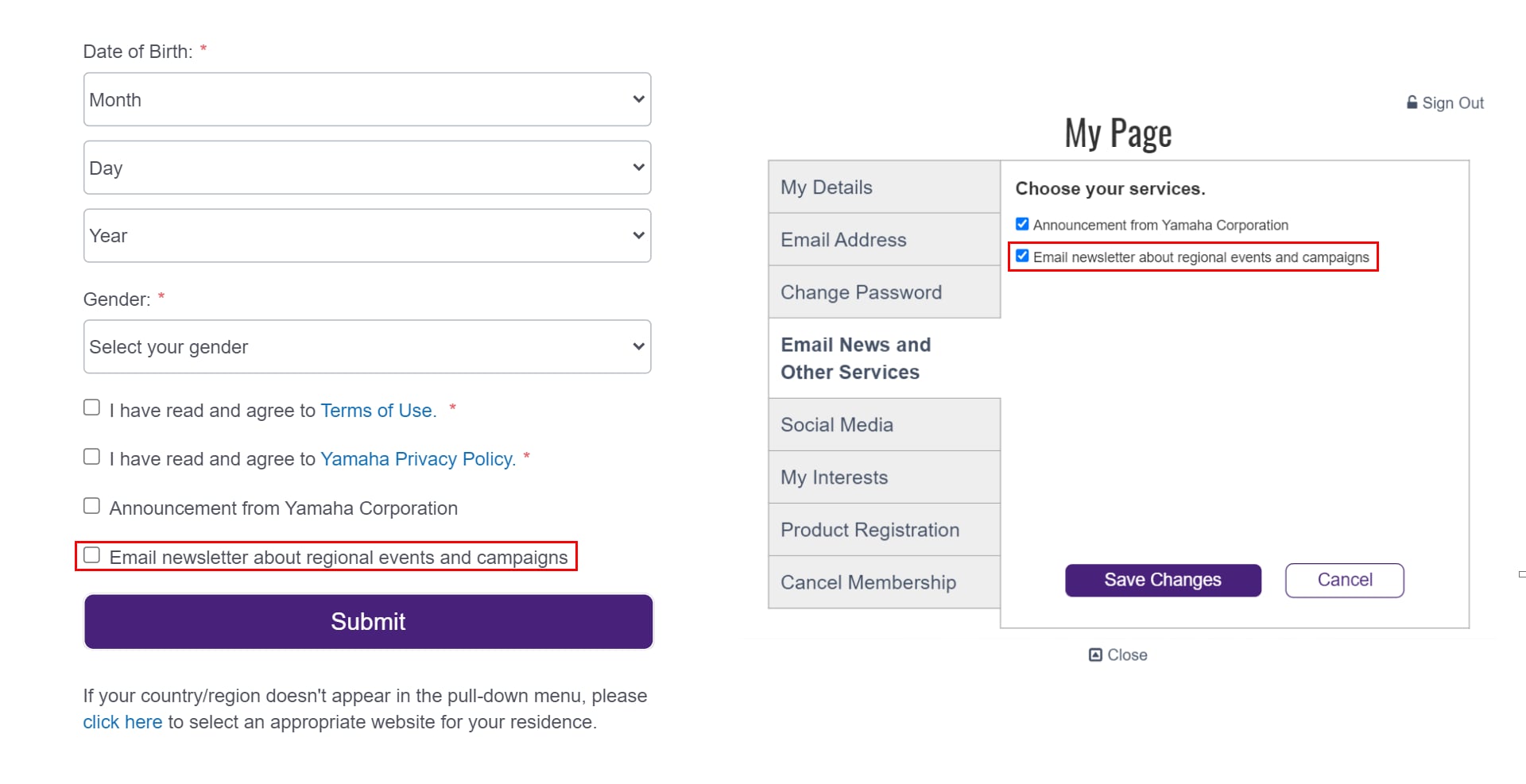 If you have already registered on My Page, please check that "Email newsletters about regional events and campaigns" is checked in the Email News and Other Services section of My Page (Refer to the image at right).