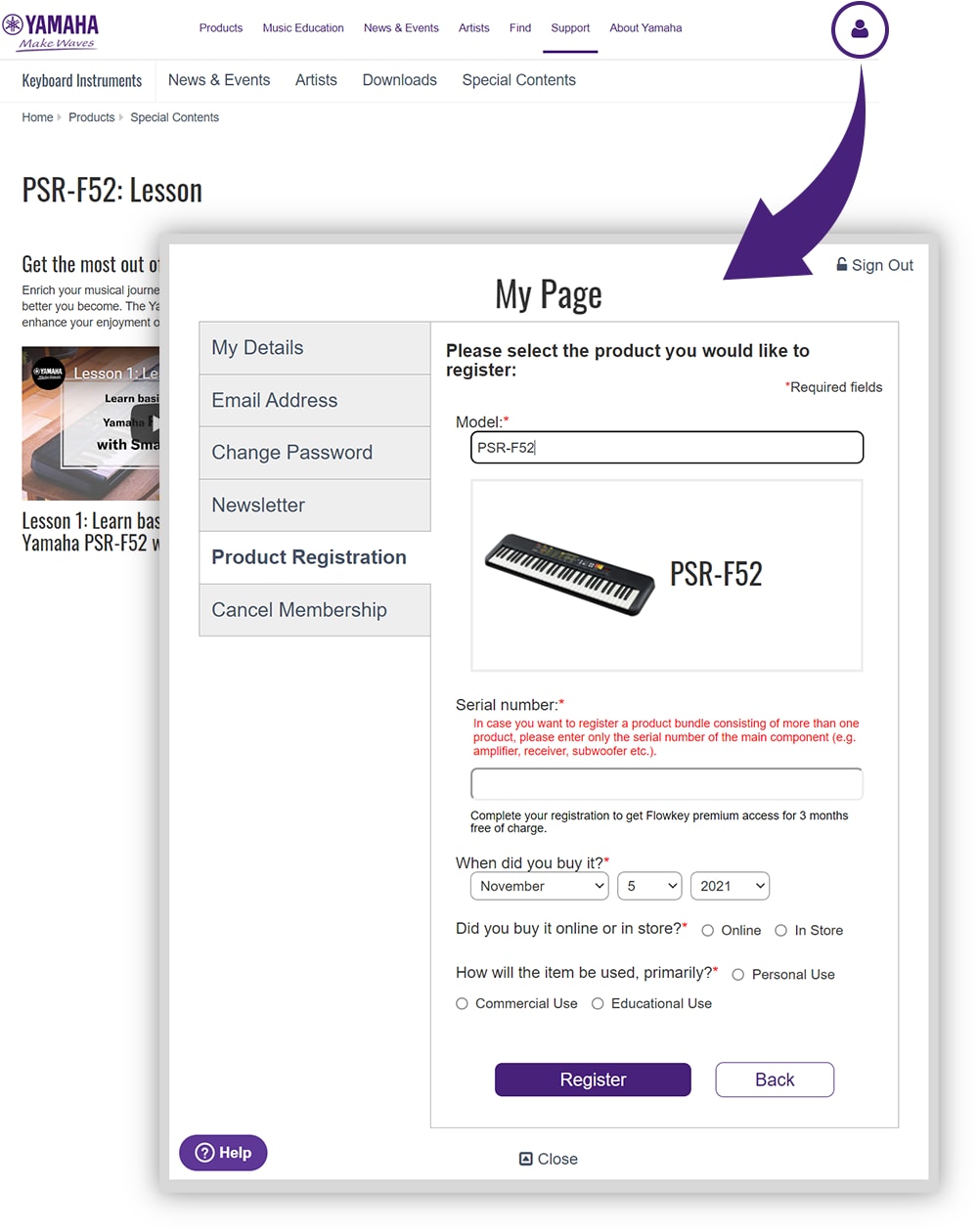 We will send a series of e-mails to people who register their PSR-F52.These e-mails will contain links to lesson videos that show you how to play the songs in the Song Book using the Smart Chord function. Please check following notice before registration. ※We plan to send the first lesson video in late 2021 or early 2022.
