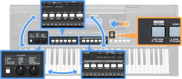 PATTERN-funksjonen gjør at du har en mengde med kraftfulle loops og taktslag like for hånden for øyeblikkelig å lage dynamisk variert musikk på farten, som en DJ, og tilpasser Live Controll knappene for enda mer lydvariasjon.