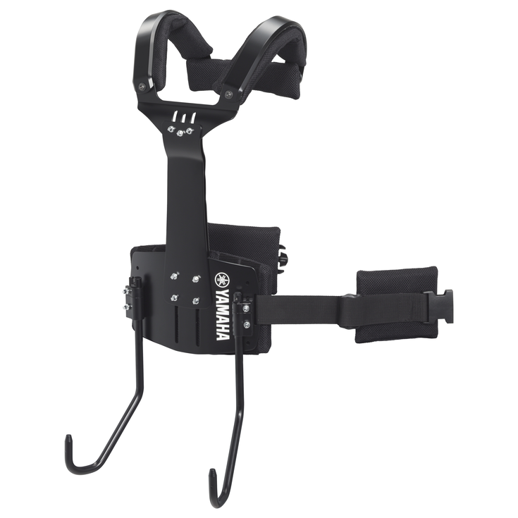 Adjustment mechanisms provided for the belly plate, chest plate, and arm attachment sections make it easy to achieve an optimum fit for users with a wide range of body shapes, while also allowing easy adjustment of instrument height to suit personal preference and maximize playability.