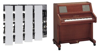 Compared to conventional damper mechanisms that use a pivoted damper arm, the damper mechanism in the new models moves perpendicularly to the natural and accidental tone bars and contacts them evenly for improved damping. The new mechanism is also safer, because parts that could catch fingers have been eliminated.