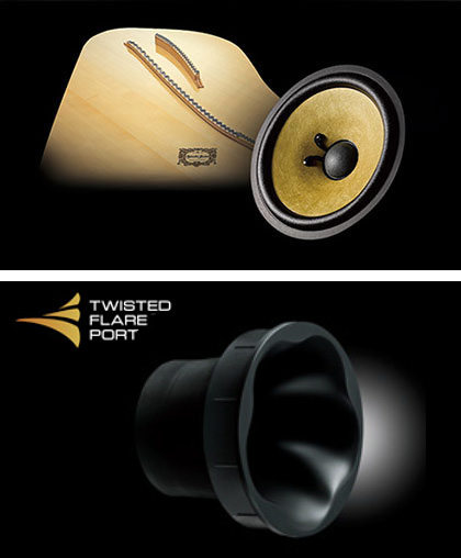 The Twisted Flare Port, a new Yamaha technology, offers a clearer bass sound. The flared and gently twisted shape evenly diffuses the air flow through the port. Compared to a conventional port, the Twisted Flare Port reduces air turbulence noise, contributing to clear and accurate low frequency reproduction.