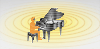 Newly developed TransAcoustic™ technology transmits digital sound directly to the piano soundboard, thus making the piano itself behave as a speaker. On a TransAcoustic™ piano, the sound that you hear is resonating directly from the soundboard. The tone generator sends an optimized audio signal to transducers that are connected by a coil to the soundboard. This sets the coils in motion, causing the soundboard to vibrate and generate sonic vibrations that travel through bridges attached to the soundboard, and are ultimately transmitted to the strings, making them resonate with sound.