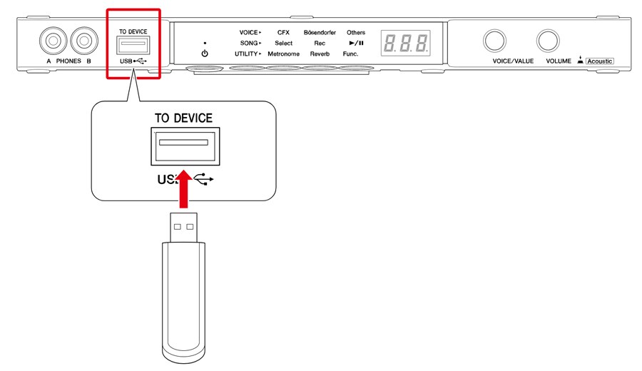 The USB TO HOST terminal allows you to connect to a computer or portable device and record high-quality audio without the need for an additional interface, while AUX OUT allows sound to be output to a variety of external devices (e.g. stereo components, IC recorders, speakers with built-in amplifiers, stereo systems), and AUX IN allows listening to sound from external devices (sound source modules and music players). MIDI OUTPUT transmits performance information to external devices such as synthesizers. MIDI IN allows the instrument to receive and playback performance information from sequencers using the tone generator of the TransAcoustic™ TA2.