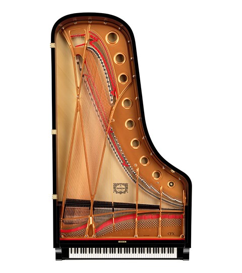 Vi brukte den øverste prosenten av europeisk grantre i lydplanken, som er kjent som pianoets hjerte på grunn av sin rolle i å overføre vibrasjoner i strengene gjennom hele pianoet. Formen på kronen har blitt raffinert for å forbedre vibrasjonseffektivitet og gi dypere, mer rikholdig midtbasslyd med mer resonans. Vidden og høyden i lydplankeribbene har også blitt modifisert for å øke den dynamiske rekkevidden.