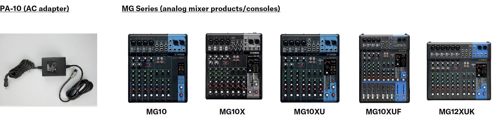 The AC adapter PA-10 is therefore unsafe and must not be used! Please note that the MG Series (analog mixer products/consoles) are not affected by this issue. If you have purchased the AC adapter PA-10, please stop using it.