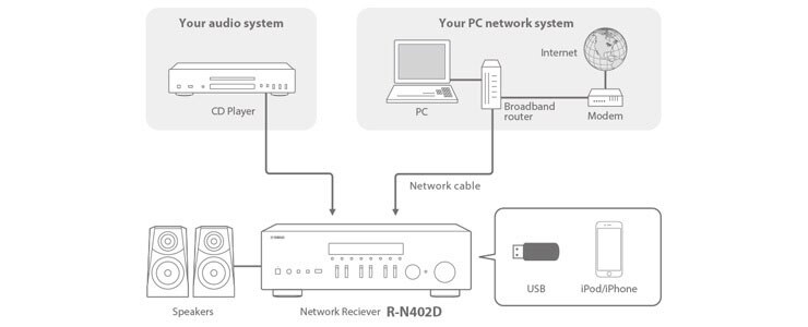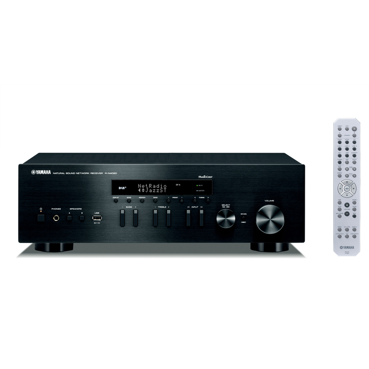 The R-N402D is a receiver and network audio player in a single unit. You can use it to easily play audio sources downloaded from the Internet and stored on a PC or NAS system. Or, enjoy streaming music services and internet radio (with vTuner). Moreover, Yamaha’s original MusicCast App allows you to enjoy your favourite tunes on a smartphone or tablet device via wireless connection.