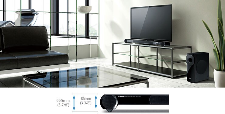 Only 86mm high, the YSP-3300 can easily be placed in front of your TV without blocking the screen. The height can be adjusted in two levels by adding the spacers. It is also wall mountable (brackets optionally available).