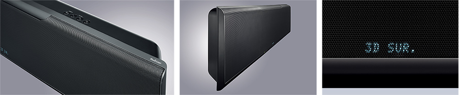 The front panel and the indicator section are covered by a mesh grille, achieving a simple, elegant look. The mesh on each end curves around to the upper panel, subtly asserting surround support. The indicator section lights only when needed, to avoid interfering with viewing. Even with its special vertical beam speakers the unit is only 1100mm, 100mm smaller than the previous YSP-5100 model, and the depth is only 93mm (without stand), making it an extremely slim presence in your room.