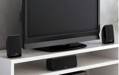 The glossy black speaker cabinets are designed to complement the appearance of most of the latest flat-screen TVs.