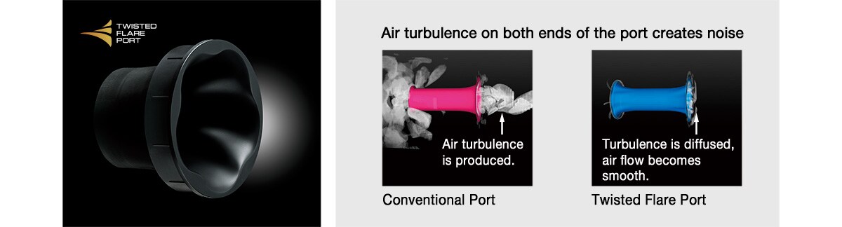 Den helt nye Twisted Flare Port bruker den omfattende subwoofer utviklingen sin erfaring. Den blussede formen, med en lett vridning tar opp en vortex av luft som blir generert rundt kanten av porte, noe som skaper en jevn flyt av luft. Dette reduserer støy utenfra som ikke er til stede i den opprinnelige inngangssignalet og gir klar og presis gjengivelse av lave frekvenser. Gjennom spesialeffekter fra filmer til atmosfæren av en levende arena, hører du bass som er klar, stram og realisisk.