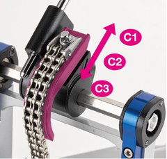 The chain drive gains tension gradually throughout the stroke as the pedal is depressed. Switching the cam from C1 to C3 reduces the initial tension.