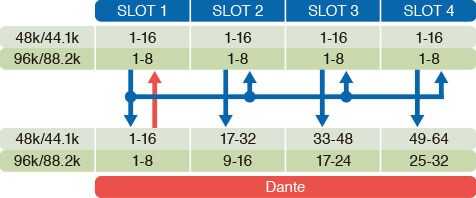 PATTERN 7: Dante 1~32* and slots 1 and 2 one-to-one / Slots 3 and 4 mutual